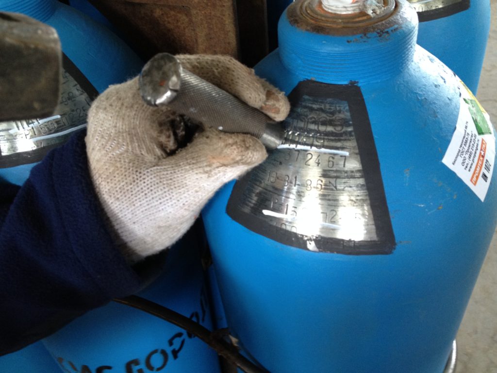На резервуарах, которые не прошли освидетельствование, деформируется резьба горловины посредством нанесения насечек или сверлится отверстие в корпусе. Это делается для того, чтобы дальнейшая эксплуатация бракованного сосуда была невозможной.