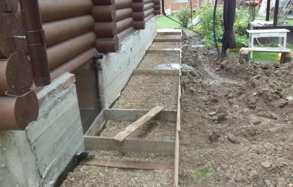 Дно траншеи устилается геотекстилем плотностью от 150 г/м³ или другим плотным гидроизолирующим материалом с нахлестом на стену в 30 см и опалубку. Следующий слой – крупнозернистый песок, толщина которого после трамбовки виброплитой или ручным приспособлением, должна составлять не менее 20 см. Затем вокруг дома укладывается слой щебня или гравия до 10 см.