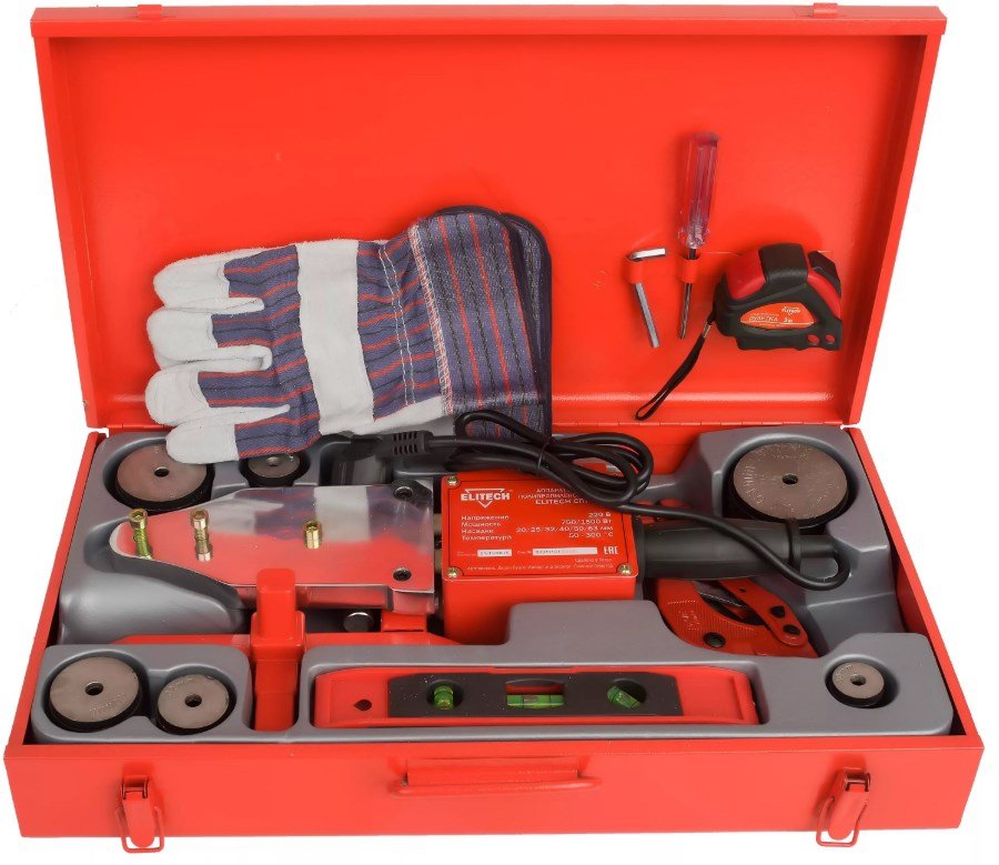 Паяльник ELITECH СПТ-800 обладает стандартной, привычной конструкцией и типичными параметрами. Мощность аппарата 800 Вт, комплектация урезана – отсутствуют ножницы для труб, рулетка и уровень. Набор насадок от 20 до 63. Это хороший бытовой сварочник, с помощью которого можно проложить трубопровод дома, в квартире, на даче, гараже. Ресурса внутреннего механизма более чем достаточно для нескольких лет неприрывного пользования. Однако бытовая модель паяльника не лишена минусов – ножка паяльника может быть с кривизной и ее придется дорабатывать. Индикаторы нагрева блеклые и на ярком солнечном свете малоразличимы.