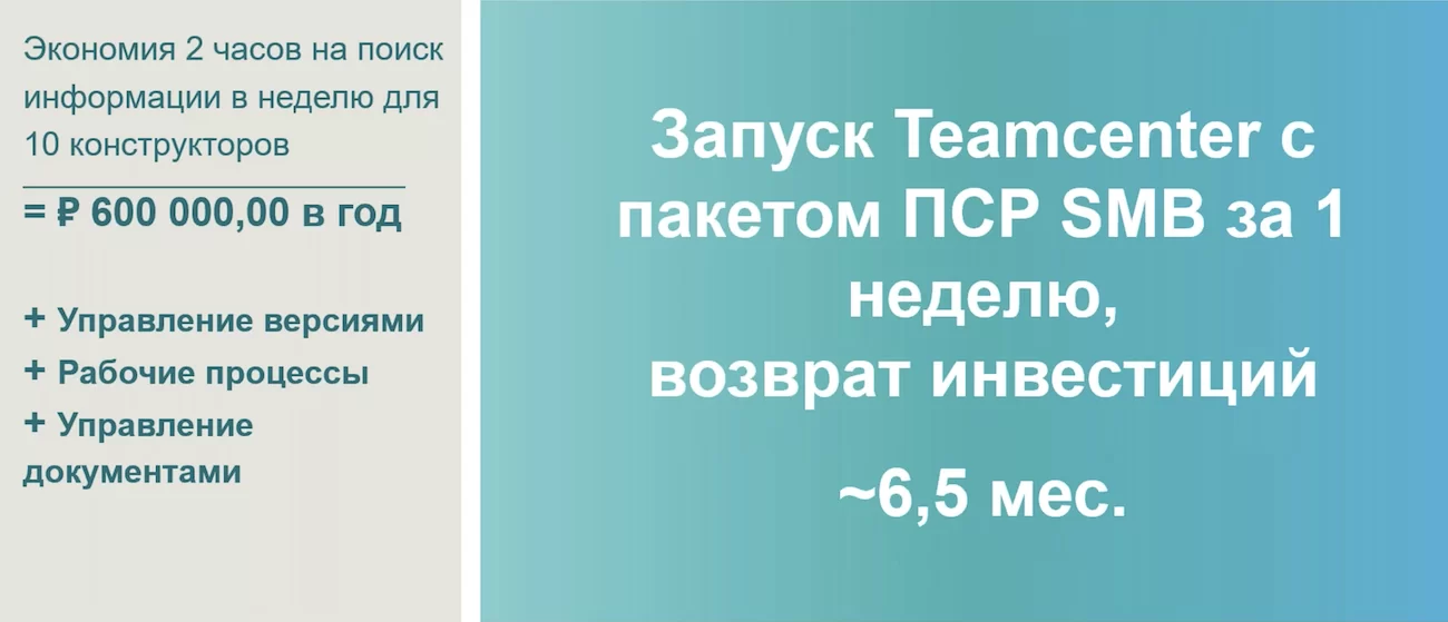 На картинке приведен пример расчета возврата инвестиций для 10 конструкторов с учетом лишь одной метрики – экономии 2 часов в неделю на поиск информации. (Если учесть сокращение количества ошибок, замену бумажного документооборота на электронный и пр. экономия времени будет ещё больше)
