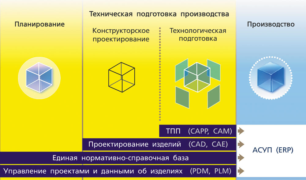 Она, как правило, объединяет несколько базовых элементов: систему для управления данными, систему проектирования и инженерного анализа, систему управления станками и оборудованием, а также систему разработки техпроцессов.