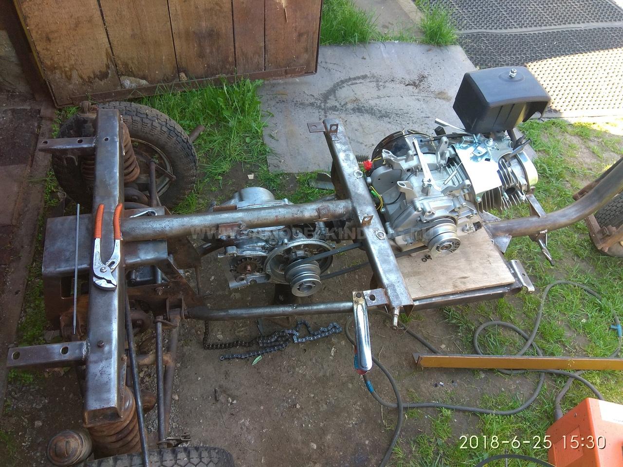 - Изготовление ходовой части. На тележку устанавливаются колеса. Чтобы сделать полный привод на оба моста, на полуоси привариваются звездочки, ставятся натяжной механизм и цепи.