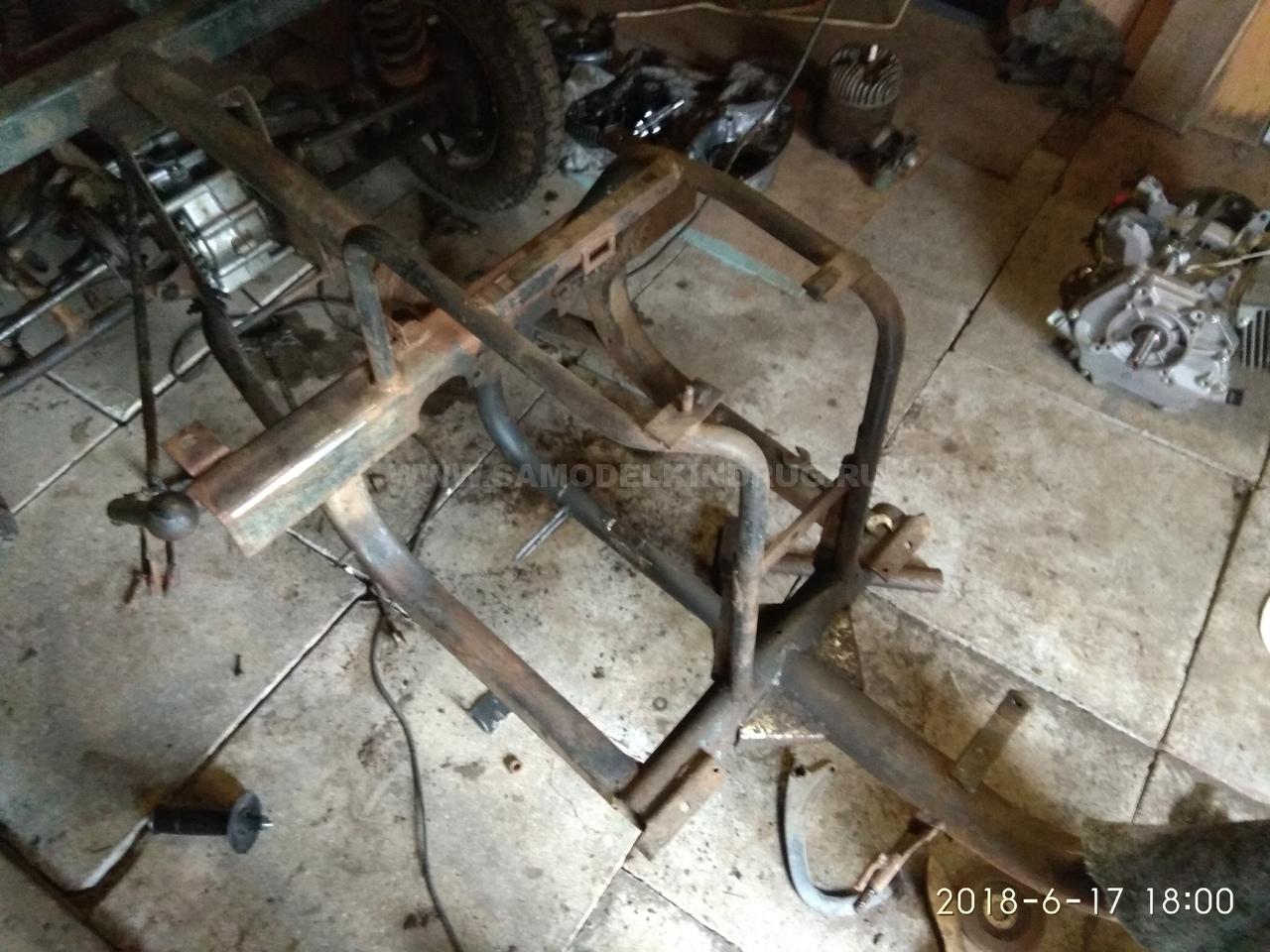 На раме располагаются все элементы мотоблока. Конструкция рамы состоит из двух лонжеронов, которые выполнены из стальной трубы дюйм с четвертью. Передние и задние концы лонжеронов загнуты вверх, задние необходимо загнуть навстречу друг к другу, потом соединить сваркой. При изготовлении рулевого управления можно использовать мотоцикл «Иж» и его запчасти.