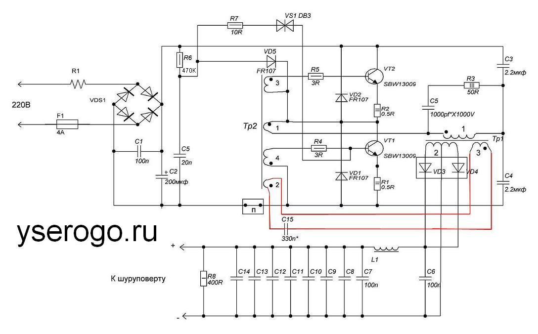 Проблема заключается в том, что выходное напряжение подобных БП переменное с частотой десятки килогерц, да ещё и промодулированное частотой 50 Гц. Оно годится для питания ламп накаливания, но не подходит для шуруповёрта. Значит, его нужно выпрямить и сгладить. Для этого используем диод VD1 и два сглаживающих конденсатора — С1 и С2, подключив их по схеме, приведённой ниже.