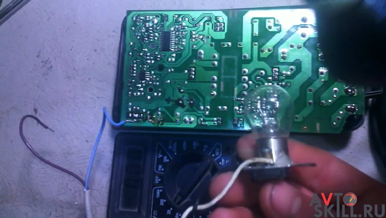 Устройство подключают к нагрузке, в качестве которой может выступать лампочка на 21 Ватт или примерно 2 А.