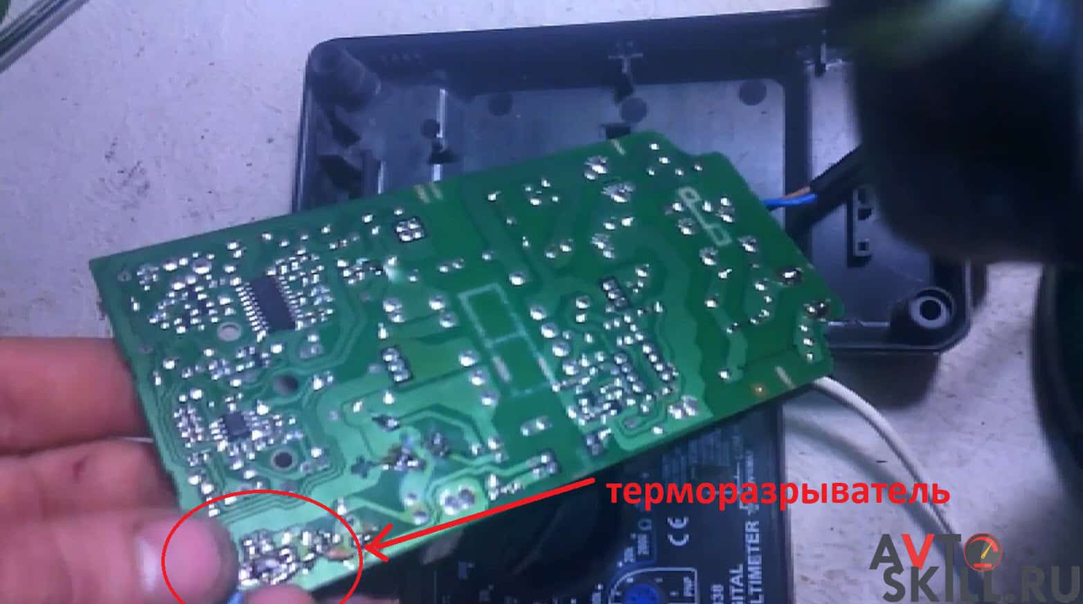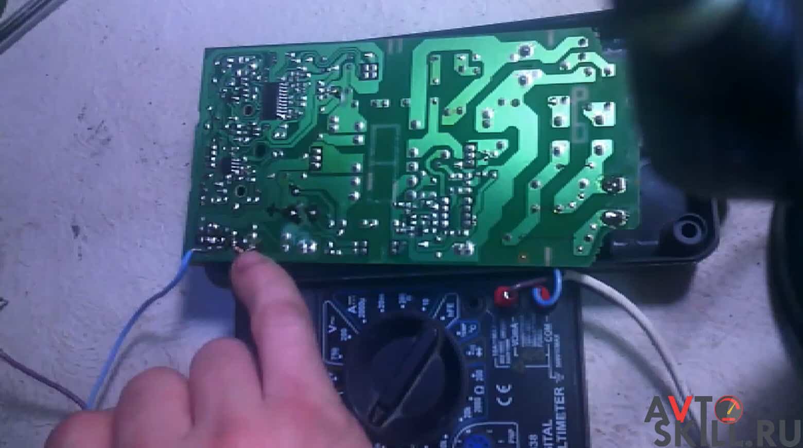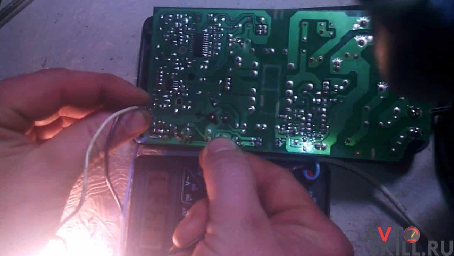 Если не загорается индикатор включения, проверяют первичную обмотку трансформатора. Для этого измеряют тестером сопротивление, коснувшись щупами штырей вилки. Если есть обрыв, вскрывают корпус. Возможно, сгорел сетевой предохранитель, который меняют.