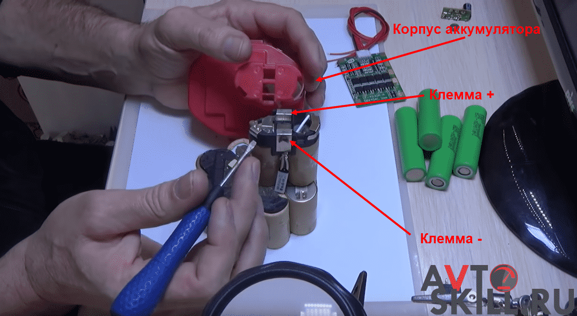 Аккумулятор шуруповерта вынимают из корпуса. На маленьком пластиковом коробе белого цвета будет написано, что он является тепловой защитой. Этот элемент вместе с черными проводками нужно выпаять и припаять к клеммам зарядного устройства. Теперь белый и черный провода припаивают к защите, соблюдая полярность.