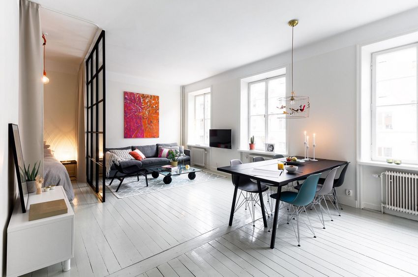 Стеклянная перегородка позволяет разграничить помещение, сохраняя в то же время ощущение открытости пространства. При использовании матового стекла можно добиться более четкого разделения на зоны без утяжеления интерьера. Недостатком в этом случае будет более долгий, трудоемкий процесс уборки комнаты, так как придется протирать большие стеклянные поверхности.