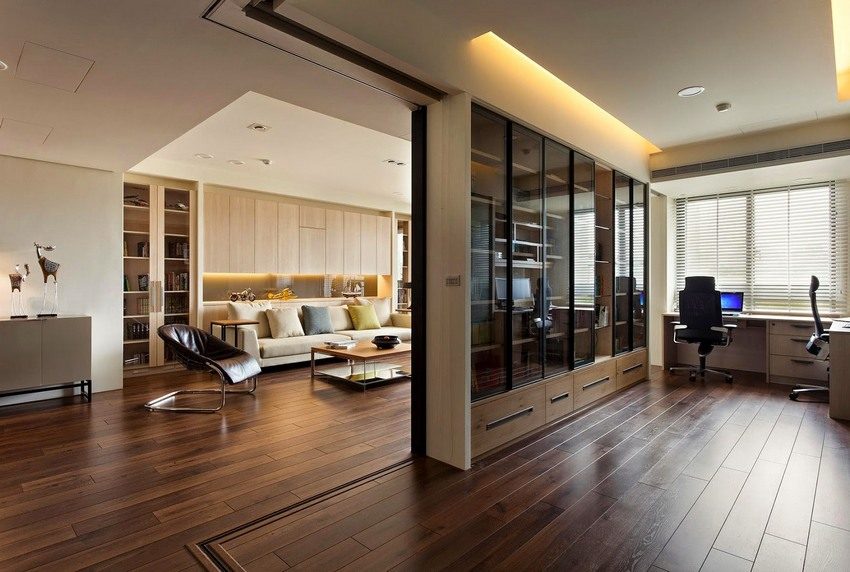 Первые предусматривают наличие стекла, которое комбинируется с древесно-стружечной плитой. Вторые — самые распространенные, так как могут обеспечить и шумоподавление, и полную изоляцию. А вот если есть желание, чтобы перегородка из ДСП позволяла регулировать степень открытости, можно дополнить ее жалюзи.