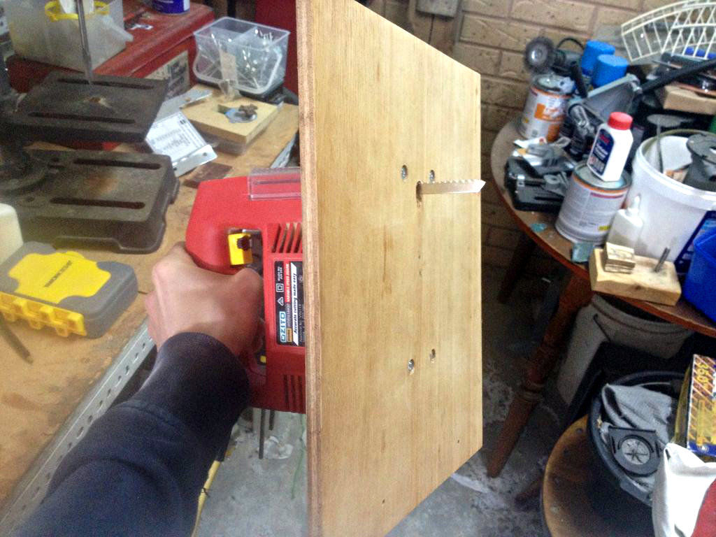 - Теперь можно просверлить четыре отверстия в фанере, раззенковав их перовым сверлом, чтобы шляпки винтов были вровень с поверхностью. Осталось сделать отверстие под пилку.