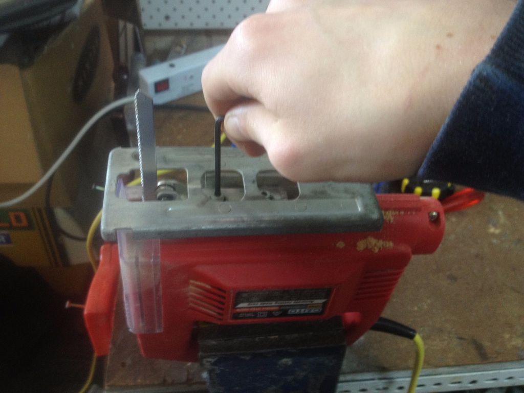 - Снимите подошву с лобзика, с помощью идущего в комплекте шестигранника. В крышке уже есть одно отверстие, вам осталось просверлить еще три, чтобы в каждом углу было монтажное отверстие.