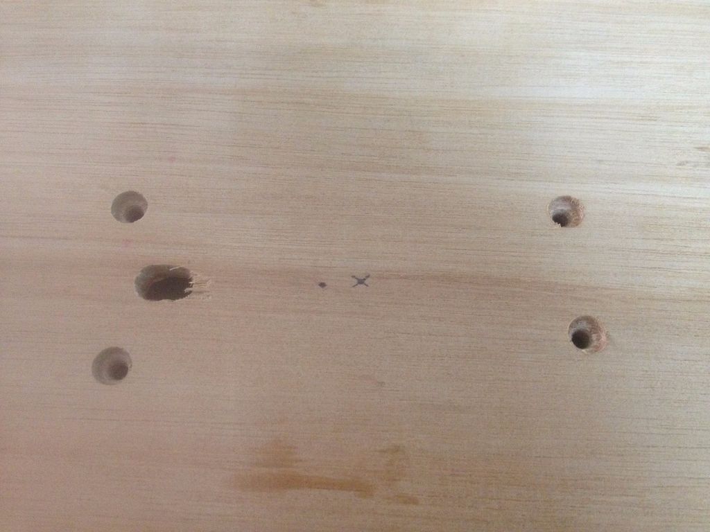 2. По центру поверхности собранной столешницы намечаем будущие отверстия для пилки и нескольких креплений для лобзика. Для этого снимаем с электролобзика подошву, прикладываем её противоположной (не плоской) стороной к будущему месту крепления и делаем несколько точек через пазы подошвы. На данном этапе необходимо соблюдать точность, так как, устанавливаемый снизу лобзик должен иметь максимально точное, перпендикулярное расположение боковым граням стола, во избежание перекоса пилки при дальнейшей работе. Отмеченные точки, просверливаем сверлом на 3-4 мм, а центральную (для пилки) на 10 мм. Как на нижеприведенных фото.