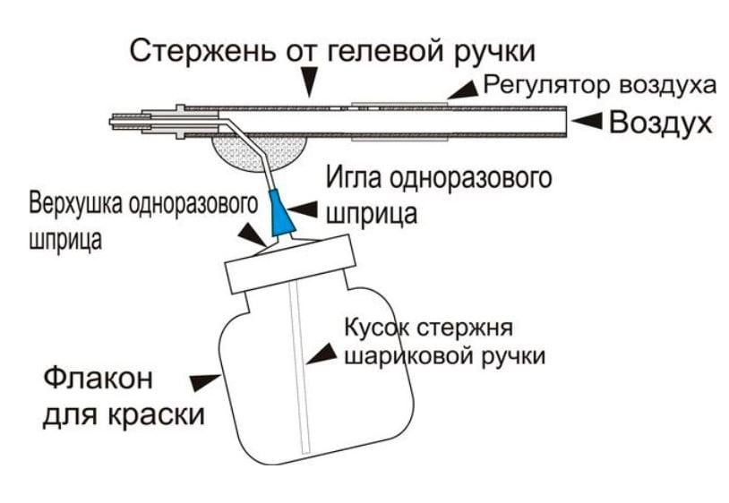 Пластиковую бутылку берут на 1,5 л. В ее стенке проделывают отверстие, куда продевают ниппель от велосипедной камеры, обрезанный по кругу диаметром 3 см, приклеивают. Этот узел служит для нагнетания воздуха в емкость. Распылитель краски приклеивают на крышку бутылки холодной сваркой, ожидают полной полимеризации. Предварительно в крышечке просверливают отверстие под трубочку форсунки.