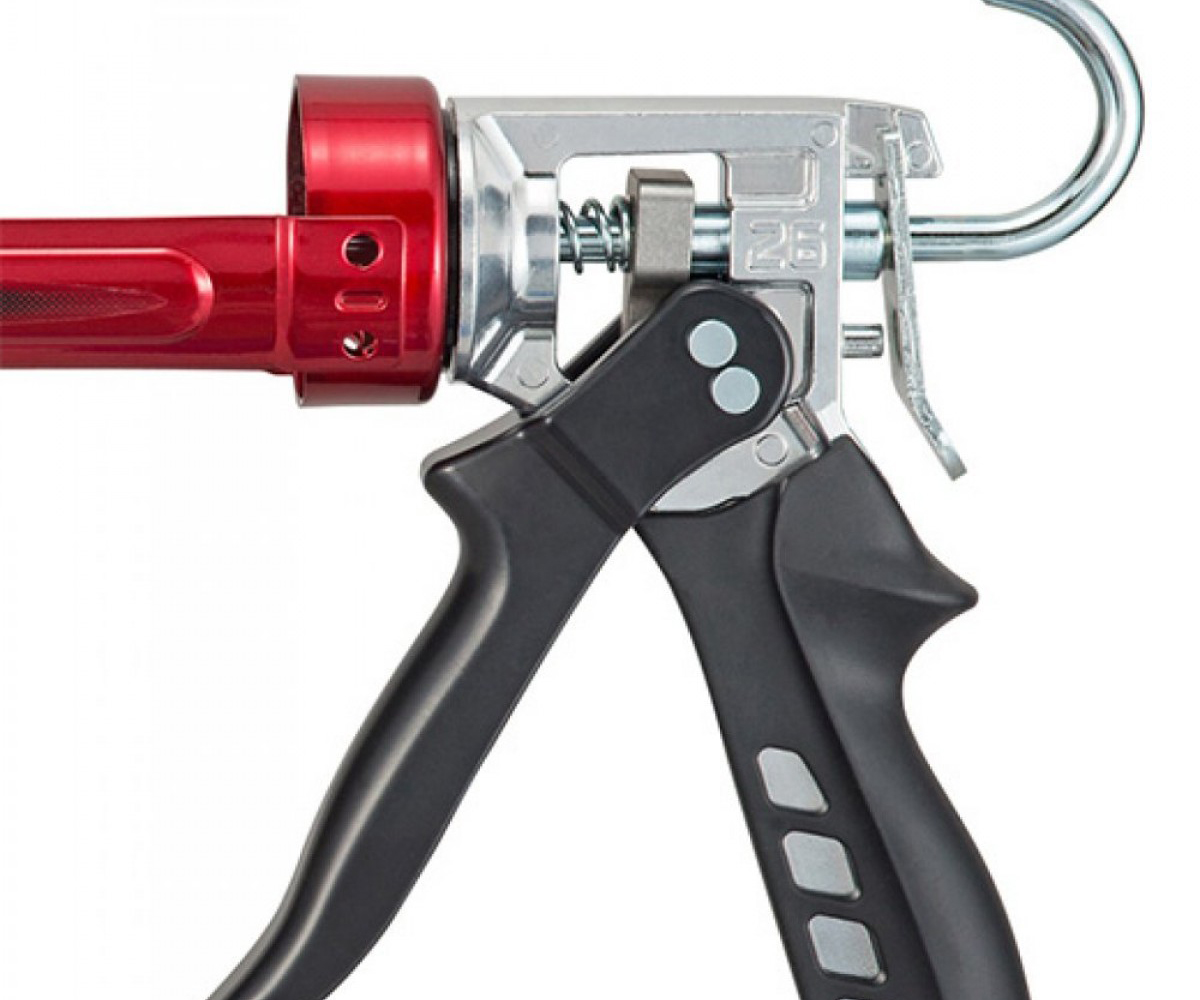 Прочная полузакрытая конструкция, которая работает с картриджем (объем до 310 мл). Изделие выполнено из прочных материалов. Сварные швы отличаются надежностью и не деформируются после разового применения. Эргономичная рукоятка позволяет снизить нагрузку на кисть, что положительно влияет на качество проводимых работ.