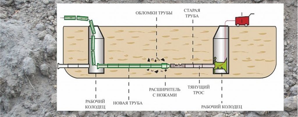 Реновация трубопроводов сетей канализации происходит следующим образом: по действующему канализационному трубопроводу с одной стороны протягивается трос, после с другой стороны крепится специальный расширитель и новая труба ПНД (полиэтилен низкого давления). После всех подготовительных действий, запускается установка и происходит замена чугунной канализации на пластиковую трубу. Старый трубопровод разрушается и вдавливается в грунт, а на его месте прокладывается надежная ПНД труба со сроком службы 50 лет.
