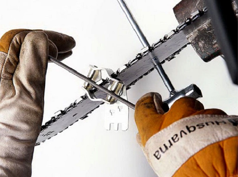Чтобы упростить процесс используют специальные приспособления для заточки цепей бензопил в виде держателей, с помощью которых определяют глубину размещения ограничителя и угол заточки. Правильный станок закрепляют на шине струбцинами и выставить под углом направляющие, посредством которых уточняется градус заточки. Зуб, подвергаемый заточке также надо закрепить упором, поверх которого и кладут напильник.