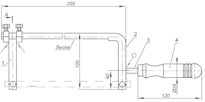 Конструкция ножовки: 1 – стойка; 2 – рамка-держатель; 3 – хвостовик; 4 – ручка