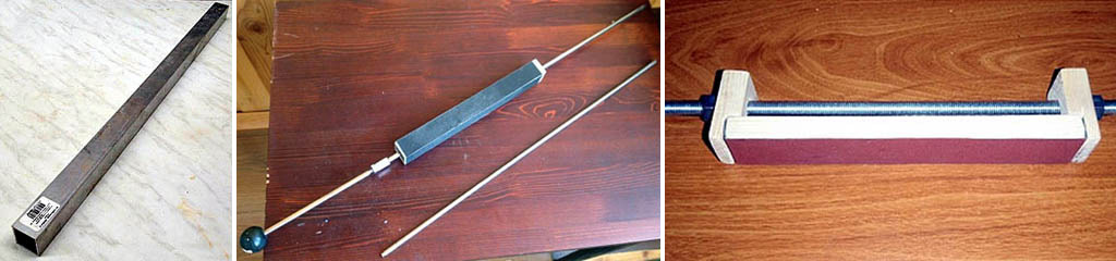 Самодельная точилка для ножей будет гораздо удобнее и точнее, если оселок к ней не покупать, а сделать из отрезка квадратной профтрубы длиной 200-300 мм (слева на рис. ниже) или деревянного бруска.