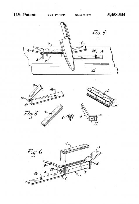 Предлагаемое устройство является более развитым по сравнению с предыдущим. В нем жестко закрепляется затачиваемое лезвие и фиксируется угол наклона наждака по отношению к лезвию. Еще одно отличие состоит в том, что в этом устройстве подвижной частью является камень, а не лезвие.