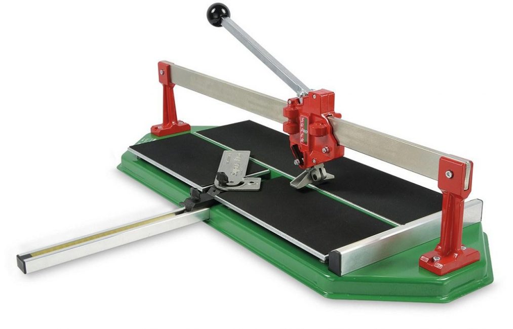 Механический тип плиткорезов имеет простой принцип действия: ролик проходит по намеченной полосе, а лапка с опорами прижимается к месту разреза. Плитка ломается точно по сделанному распилу. В таком случае исключительно острое приспособление сделает распил без сколов. Рекомендуются следующие модели.