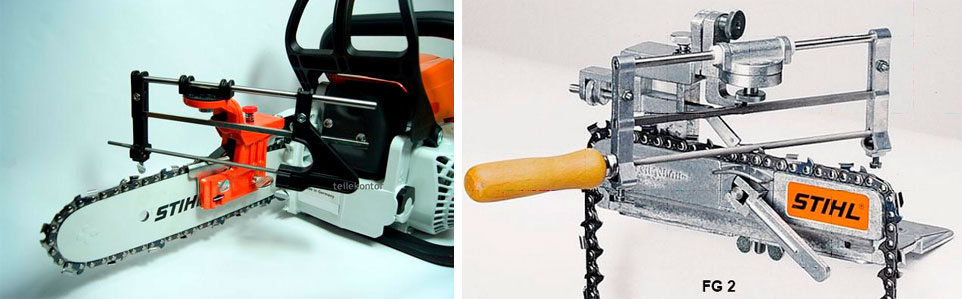 На вид станок с ручным приводом напоминает лучковую пилу. Разве что на месте, где бы располагалось полотно такой пилы, находится напильник. Такой станок даёт возможность наточить и подогнать зубья бензопилы под нужный размер. В станок встроен механизм, благодаря которому можно выстроить нужный размер.