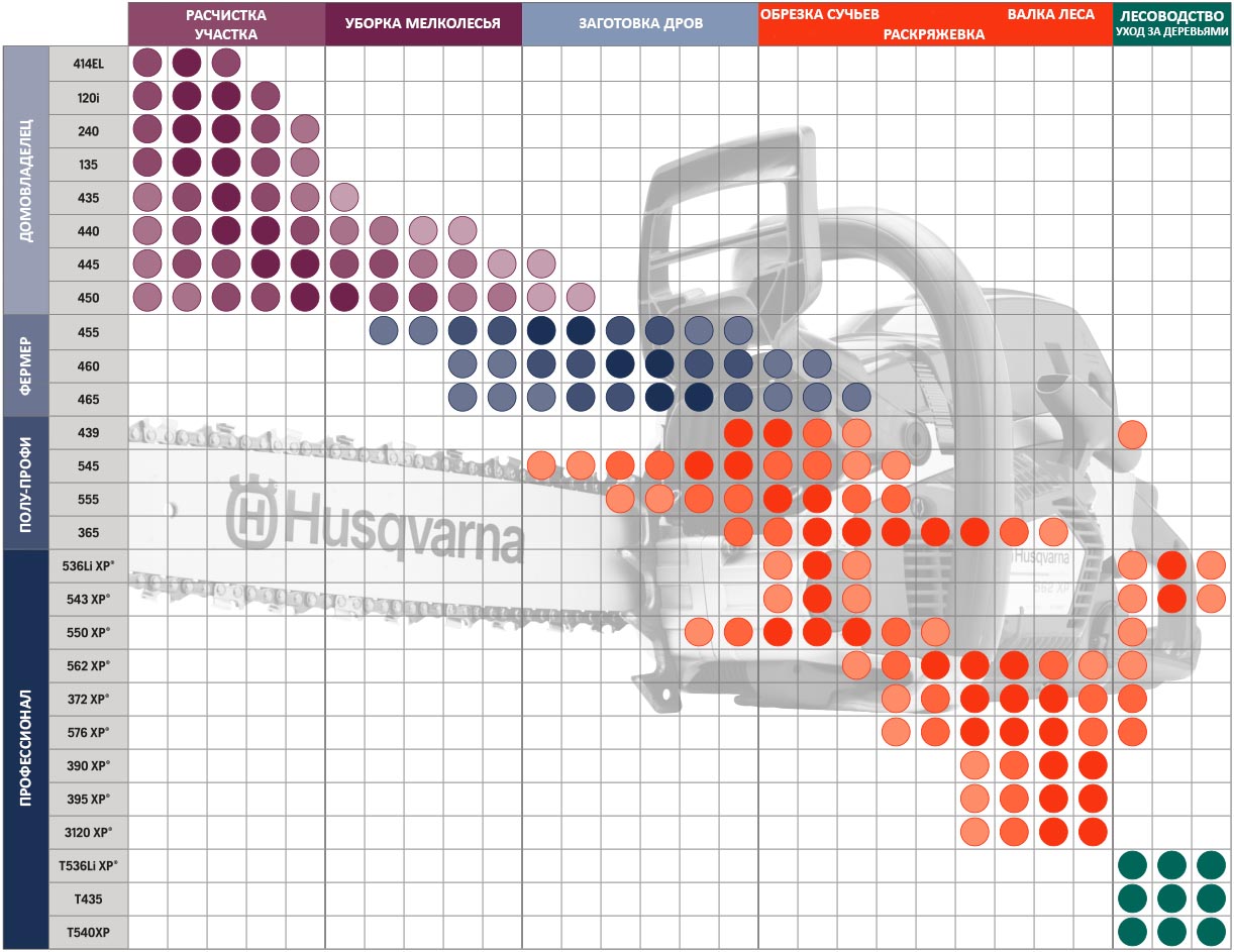 Различные предназначения бензопилы перечислены в шапке таблицы. Целевая аудитория и модели бензопил Husqvarna указаны слева. Используя точки найдите оптимальный тип и модель бензопилы для ваших нужд. Ниже мы приведем краткое описание каждой модели и укажем их технические характеристики.