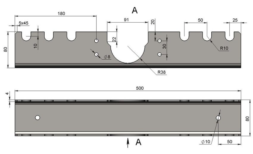 - Просверлить в двух металлических планках по два отверстия диаметром 0,5 и 0,75 дюймов. Расстояние между осями отверстий должно быть ровно 80 мм (сумма радиусов обеих роликов).