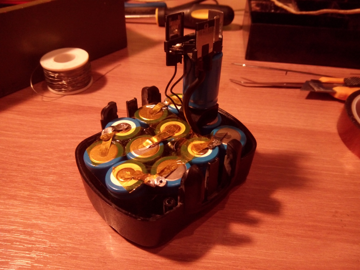 При сборке соблюдайте крайнюю осторожность, не закорачивайте банки, а также следите их полярностью. После соединения элементов батареи лучше их соединить между собой клеем