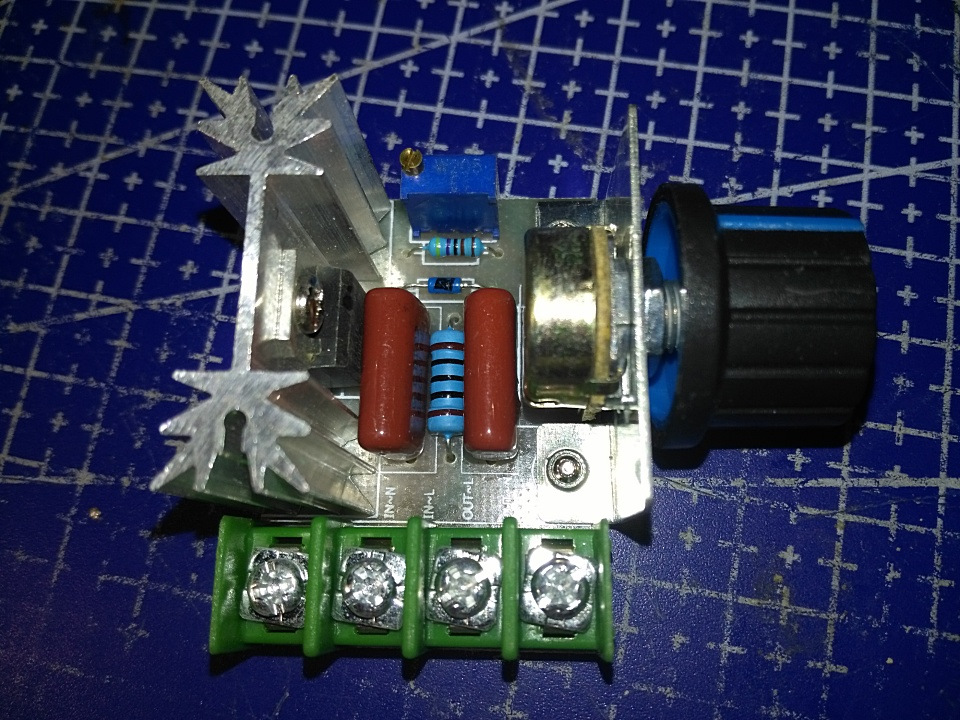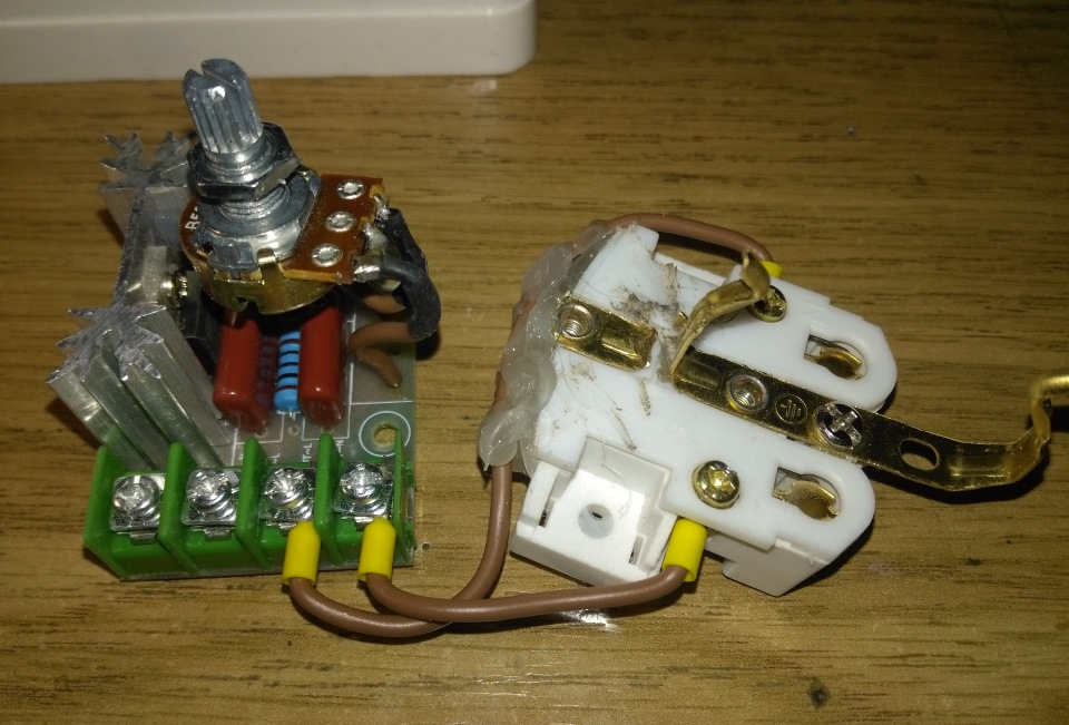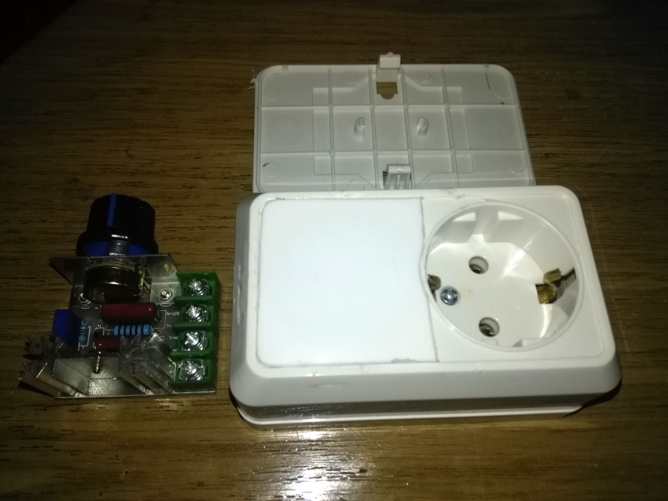 Сделал его в корпусе внешней, двухрозеточной коробки, одну часть корой использовал под блок регулировки, а вторая розетка, куда и подключается УШМ. Для этого саму колодку с розетками пришлось секвестировать. Да так, чтобы оставить крепление для винта держащего корпус розетки.После чего из белой мыльницы вырезал пластинку с отверстием под регулировочный резистор.Так как изначально резистор был припаян к плате, то чтобы его разместить как задумал, пришлось его выпаять из платы соединив с платой проводами.