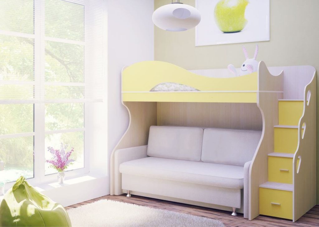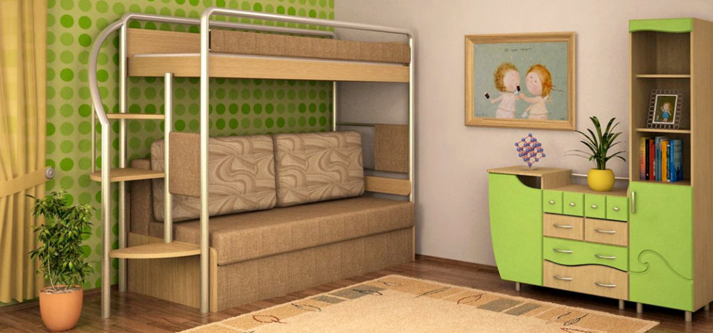 Это отличный вариант для детской комнаты, в которых живут двое детей, а также для малогабаритной однокомнатной квартиры.
