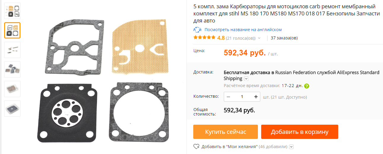 Значительная часть проблем с узлом связана с задубевшими или неисправными мембранами карбюратора. Проще всего их заменить, если это давно не делалось. В мастерских магазинах или на Алиэкспрессе продаются целые ремкомплекты (стоимость их около 200 рублей), содержащие все необходимые мембраны. Иногда за сумму порядка 600 рублей можно купить себе запчастей на весь срок эксплуатации бензопилы (см. рис.).