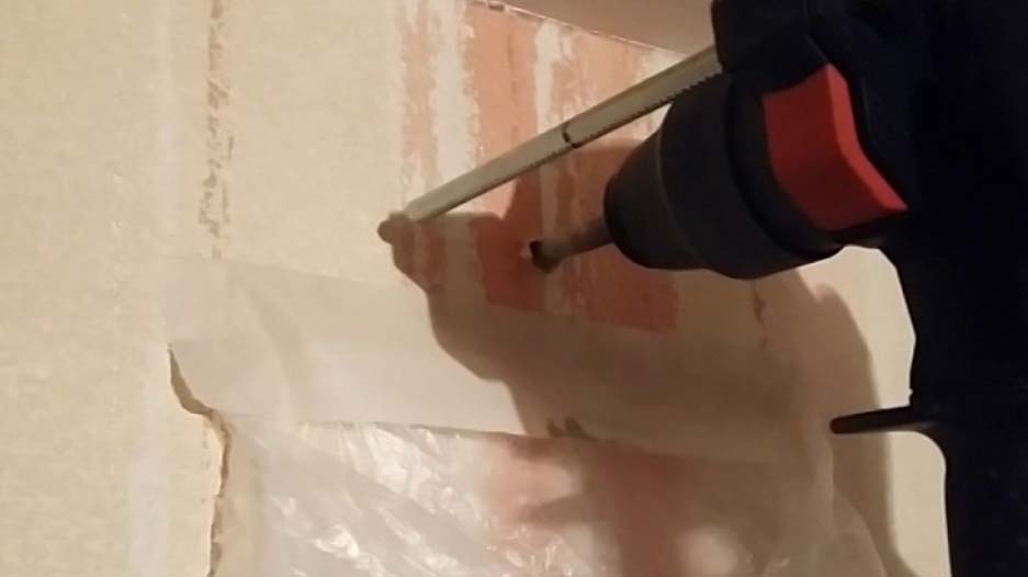 При использовании перфоратора или ударной дрели, их надо переключить в ударный режим, вставляется рабочий инструмент с победитовым наконечником и он должен быть направлен перпендикулярно поверхности стены.