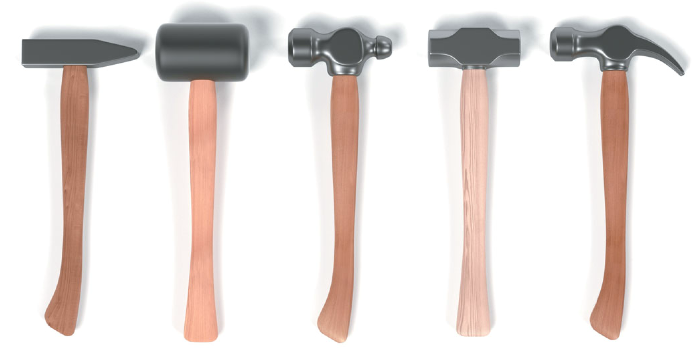 Молоток— один из древнейших инструментов, используемых человеком. Существует множество его модификаций. Молоток с закаленной головкой и круглым бойком предназначен для работы со слесарными зубилами и фасонной обработки металла. Молоток с изогнутым раздвоенным концом в виде захвата без усилий вытаскивает гвозди, но для разборки соединённых гвоздями конструкций лучше использовать модель с прямым раздвоенным концом. Молоток с поперечным вспомогательным бойком имеет прямой (тонический боек вместо гвоздодера и используется для направления гвоздя, который удерживается между пальцами. В уменьшенном варианте такой молоток идеален для крепления панельных шпилек. Для обработки листового металла, а также работ по дереву используется деревянный молоток с двумя головками (киянка) и сменными резиновыми и пластмассовыми набойками.