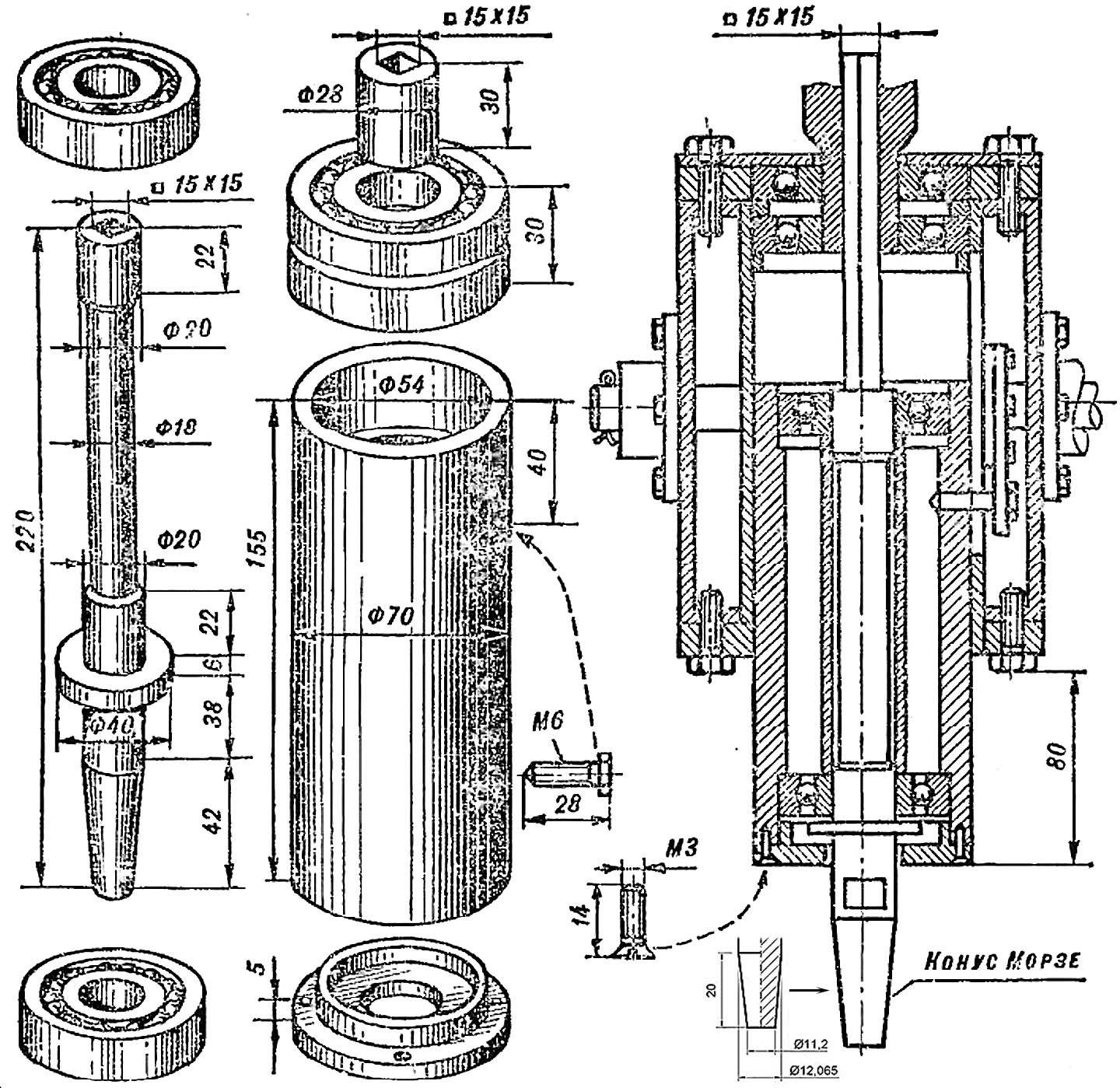 Допустим, цена на понравившуюся станину вас не устраивает. Или дрель если «ломовая», с ударным механизмом, бывшая в работе по строительным конструкциям и биение патрона видно на глаз. Тогда первым делом выясняем, если и в пределах досягаемости мастер, владеющий токарным станком повышенной точности (не грубее 0,02 мм). Что, между прочим, не факт – станок повышенной точности стоит очень дорого и на потоке расхожих заказов никогда не окупается. Но, положим, нашелся. Берем чертежик на рис. справа, идем к нему и спрашиваем, сможет ли он выточить это из стали не хуже 30ХГСА, и сколько возьмет за работу. «Это» – чертежи шпинделя настольной сверлилки. Остальные ее детали можно выточить на обычном станке, или найти в развалах на железном базаре либо у себя в хламе. Скорее всего, окажется, что купить станину + стол дешевле, а если прикинуть расходы на остальное, то, возможно, обрисуется и дрель повышенной точности. В продаже такие бывают; их можно узнать по отсутствию ударного механизма и воротнику специально для установки в станину: на него надета точеная стальная манжета.