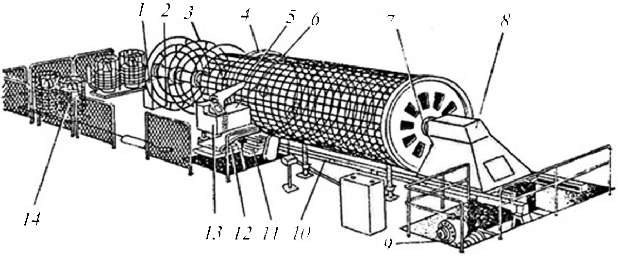 На ней используют продольную арматуру в виде мерных прутков, а поперечную — в виде проволоки, сматываемой с мотков. Установка включает в себя приводную планшайбу 4, тележку 8 с конической оправкой, привод тележки 9, синхронизатор планшайбы, сварочный агрегат 13, бухтодержатели 14 для поперечной арматуры и электрооборудование. Планшайба выполнена в виде диска, установленного на роликовые опоры и соединенного с валом 2, задний конец которого опирается на подшипник стойки 1. Привод планшайбы осуществляется от четырехскоростного электродвигателя через промежуточные передачи и зубчатый венец. На приводной планшайбе закреплена сменная цилиндрическая оправка 5, имеющая направляющие для ориентации продольных арматурных стержней, которые поддерживаются также распределительными кольцами 3, установленными на валу планшайбы. Тележка перемещается на катках в продольных направляющих 10 установки. На шпинделе 7 установлены сменные тянущие конические оправки с быстродействующими шариковыми зажимами для закрепления концов продольных стержней каркаса. Для предотвращения скручивания свариваемого каркаса вращение с приводной планшайбы передается на конусную оправку с помощью синхронизирующего вала. Привод тележки осуществляется от электродвигателя постоянного тока и асинхронного электродвигателя для ускоренного возврата тележки в исходное положение. Сварочный агрегат 13 состоит из трансформатора, сварочной головки 6, суппорта 11 продольной подачи головки, поворотной платформы 12, суппорта поперечной подачи с приводом и механизма поворота. Сварочная головка имеет два точечных электрода сопровождения, закрепленных на концах штоков плунжерных гидроцилиндров. Механизм приема каркасов представляет собой две стойки с поворотными рычагами, несущими приемные штанги. Бухтодержатель для поперечной арматуры имеет вертикальную ось, на которую надевается съемная вертушка, и тормозное устройство.