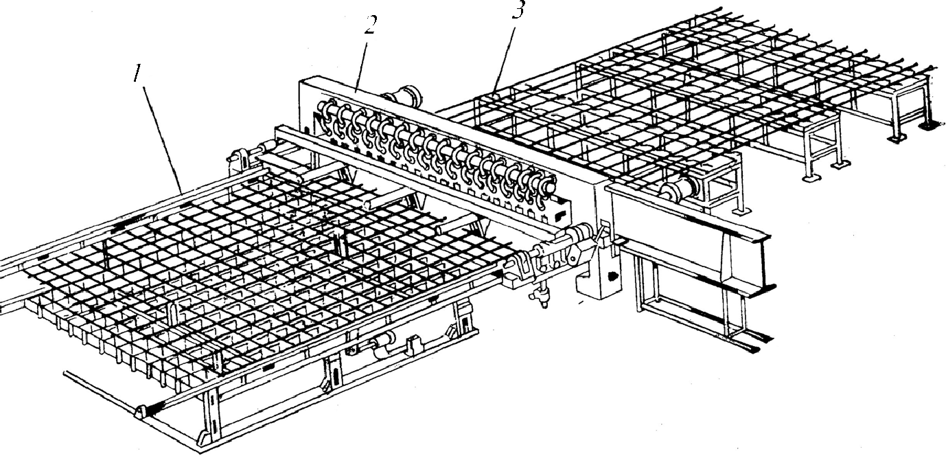 Данная линия (рис. 6) предназначена для изготовления арматурных сеток шириной до 3800 мм с продольной арматурой диаметром до 12 мм и поперечной — диаметром до 10 мм. Как поперечная, так и продольная арматура применяется в виде мерных прутков. В состав линии входят столы 3, с которых продольные прутки подаются вручную в начале сварки каждой сетки к электродам сварочной машины 2. Сваренная сетка принимается на пакетировщик 1 марки СМЖ-61В.