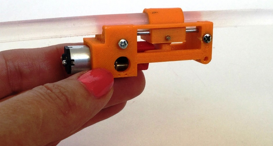 В экструдере применен возвратно – поступательный механизм и маленький мотор с редуктором. Попытка сделать экструдер подобный 3D принтерному была неудачной, так как клеевой стержень намного мягче прутка филамента.