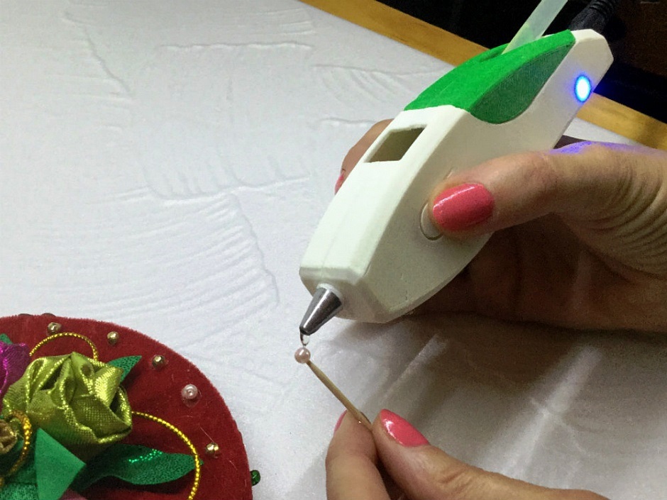 Приготовьте заранее все необходимое для работы. Сделайте разметку мест, где должен наноситься клей, приготовьте нужные вам аксессуары и материалы, бижутерию. Время работы пистолета недорогой модели ограниченное и потребуется его выключать для охлаждения. Для недорогих моделей время работы 15-20 минут, а еще лучше, если вы за 10 минут вы успеете сделать намеченную работу. Учтите, что чем слабее мощность тэна пистолета, тем быстрее нужно работать, поскольку клей будет разогреваться до температуры всего 105 градусов, и потому быстрее будет застывать.
