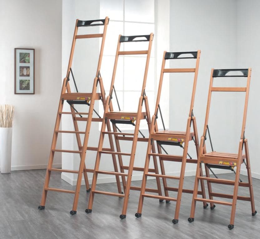Этот предмет домашнего использования тоже предназначен для того, чтобы дотянутся к необходимым вещам среди многих других «нужных» вещей, навести порядок, для которых не хватает роста. Стул-стремянка имеет много общего с табуретом-лестницей, за исключением того, что в более привычном состоянии конструкция похожа не на табурет, а на стул. Явные преимущества стула перечислим ниже: