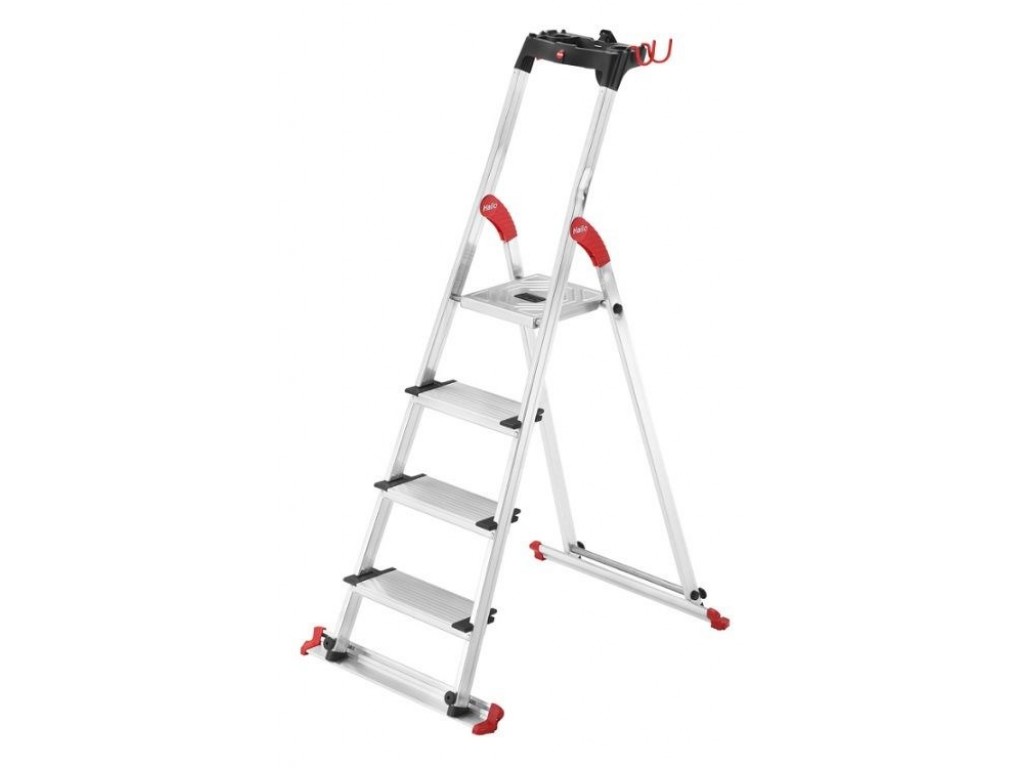 Очень удобно, когда стремянка имеет площадку, выполняя какие-либо работы, можно складывать на нее инструмент, сам человек может стоять на предпоследней ступени. Это позволяет не спускаться каждый раз для того, чтобы взять отвертку, саморез, и т.д. Площадка при этом считается за ступень.