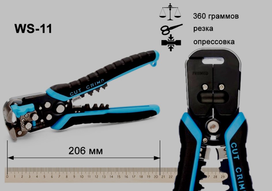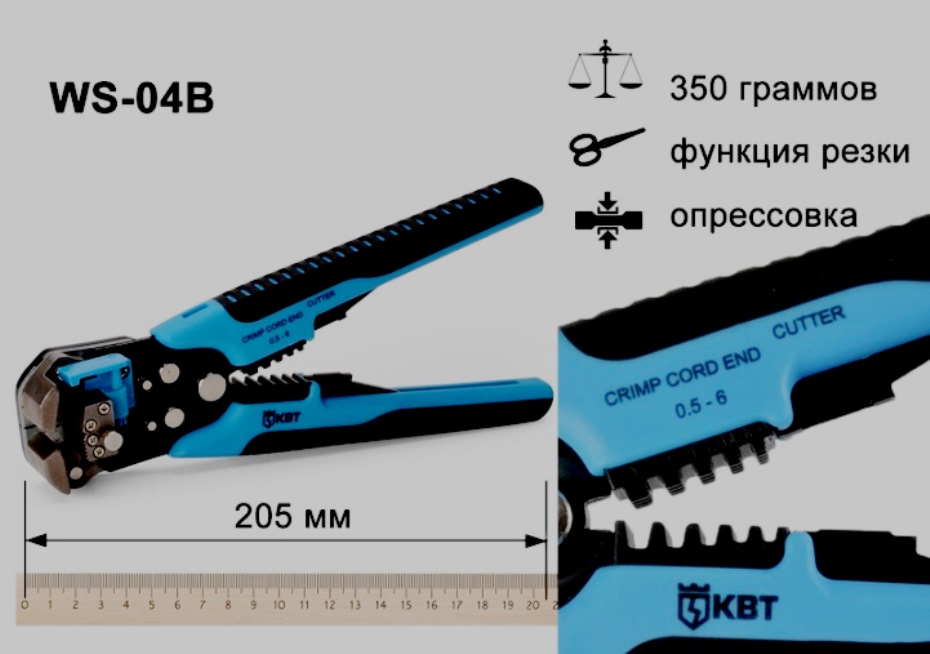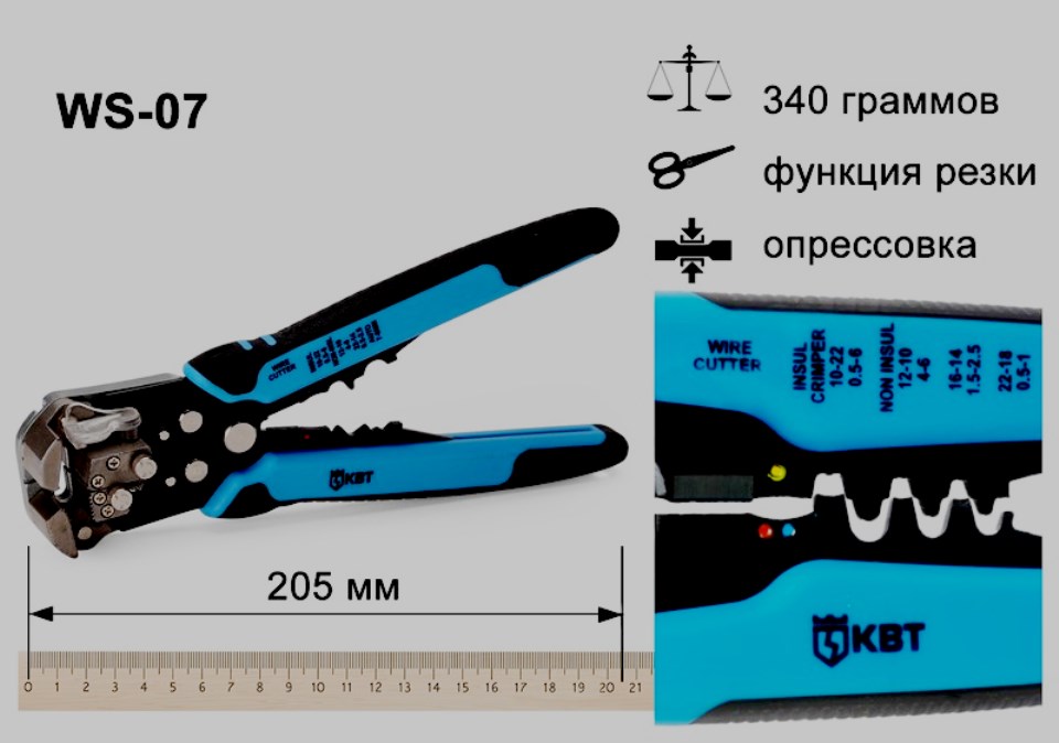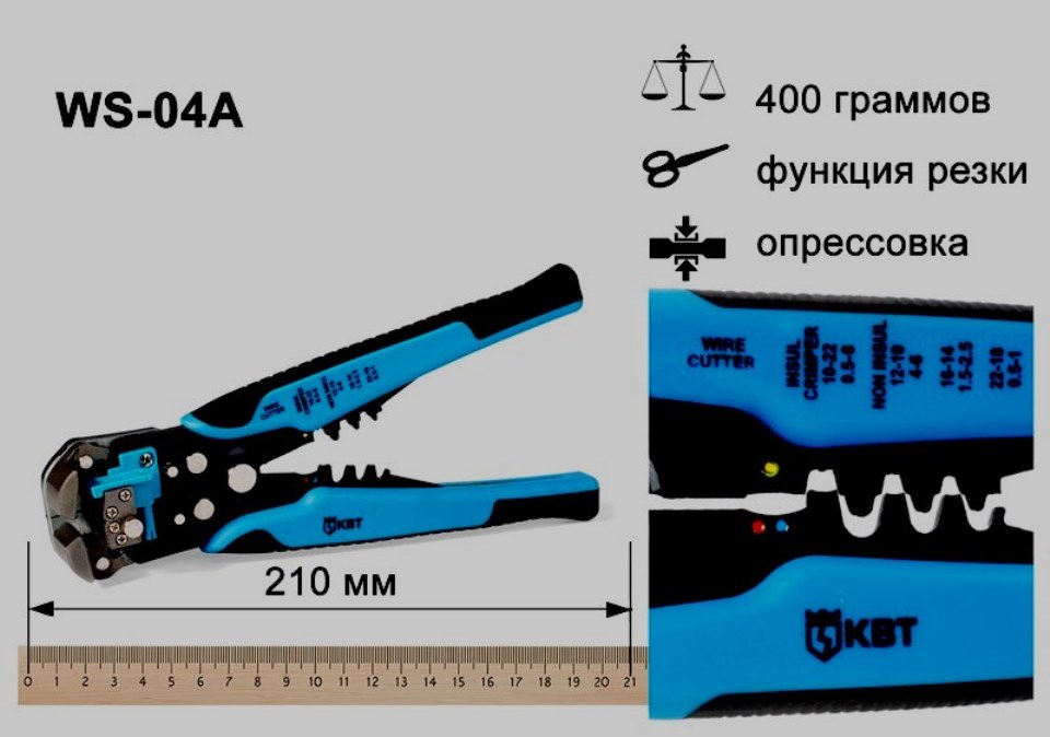 Стриппер квт ws 11 — данное устройство внешне и по своему функционалу практически не отличается от своего старшего собрата. Может снимать изоляцию, резать провода, производить опрессовку наконечников, работать с плоскими проводами.