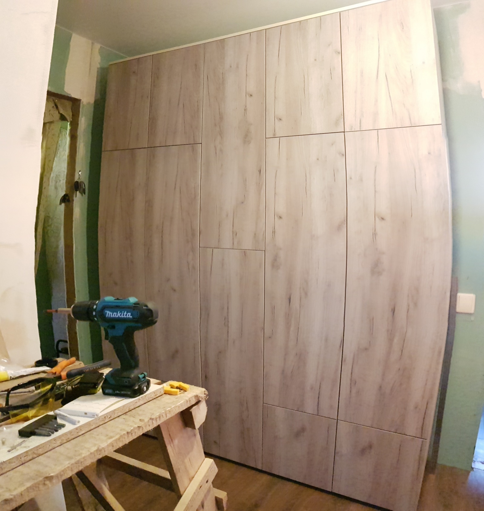 Петли решили устанавливать по месту, чтоб не попасть на полочку в шкафу.