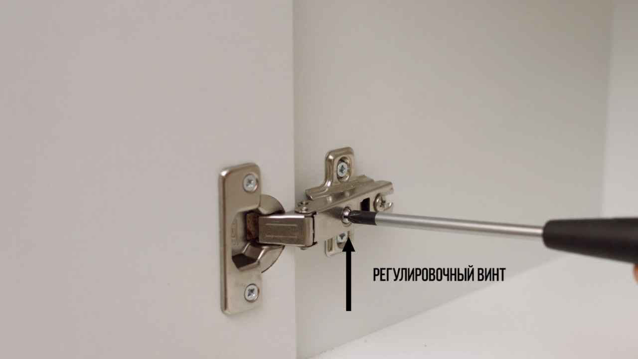- регулировка дверцы шкафчика относительно шкафчика при помощи отвертки.