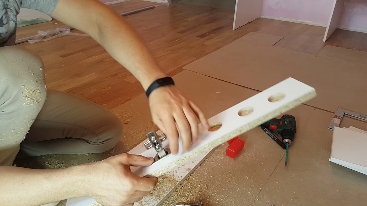 Зачастую возникает ситуация, когда требуется произвести монтаж мебельной петли в плиту ДСП, например, при установке дверцы из ДСП. Данная задача предусматривает под собой высверливание отверстия для петли в ДСП. В статье мы рассмотрим с помощью чего можно подготовить такое отверстие и как установить в него петлю. Итак, в нашем случае при изготовлении шкафа из ДСП была допущена ошибка – паз под петлю был высверлен слишком низко, в результате после установки петли в подготовленное место внутренняя горизонтальная дверца не может полностью открыться. Как итог, необходимо сместить паз немного вверх, чтобы устранить данный недостаток.