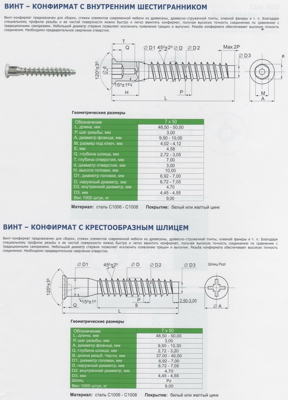 Конфирматы выпускаются из оцинкованной стали типа сталь 08 по ГОСТ 1050 и – реже – из анодированного алюминия. К крепежу обычно прилагается изогнутый торцевой ключ.