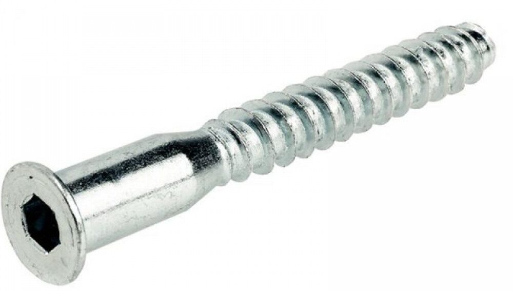 Оно универсально, поскольку размер головки не играет никакой роли в обеспечении надежности соединения. Эта часть евровинта расположена в верхней, прижимной детали. Нагрузка ложится на шляпку конфирмата, которая центрует крепеж и стягивает элементы конструкции.