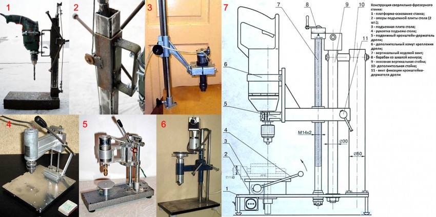 Существуют различные виды сверлильных станков, сделанных в домашних условиях. Они различаются по: материалу изготовления, структуре, размерам.