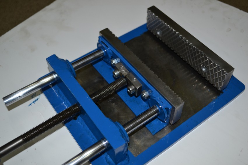 В качестве крепежа напилил пластины толщиной 6 мм, просверлил три отверстия. В центральном нарезал резьбу под болты, через два крайних пластина крепится к столу саморезами.