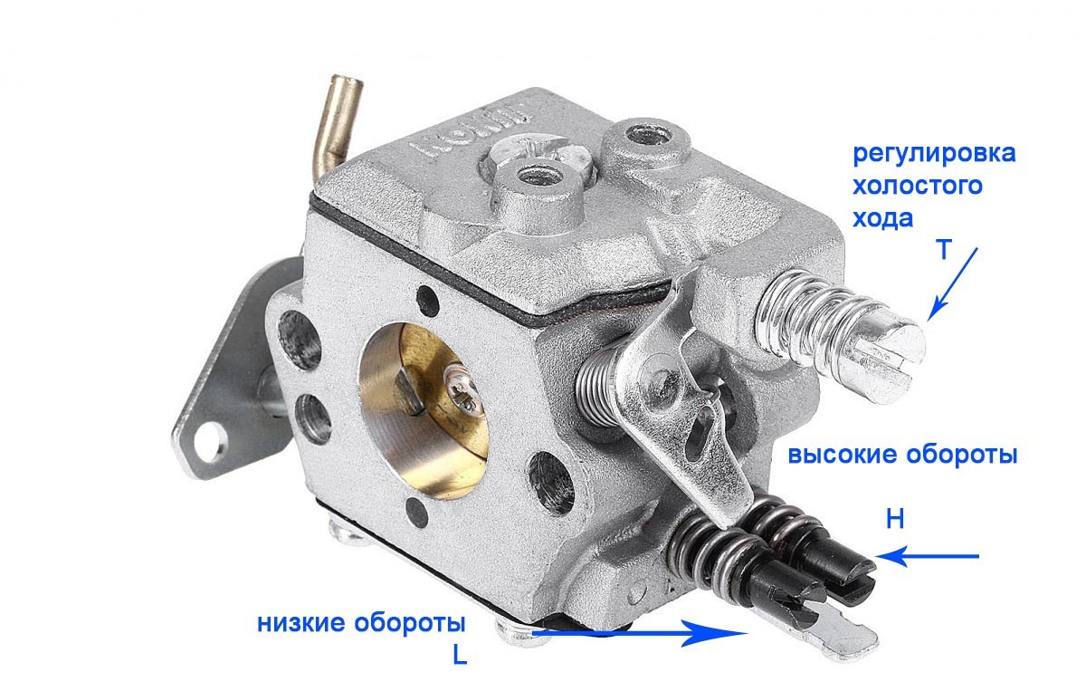 Регулировка карбюратора бензопилы обеспечивает эффективную работу инструмента на полной мощности при экономном потреблении топлива. Регулировка должна производиться при чистом топливном и воздушном фильтре. Для большего кол-ва карбюраторов регулировка осуществляется тремя винтами: для максимальных и минимальных оборотов и регулировки холостого хода.
