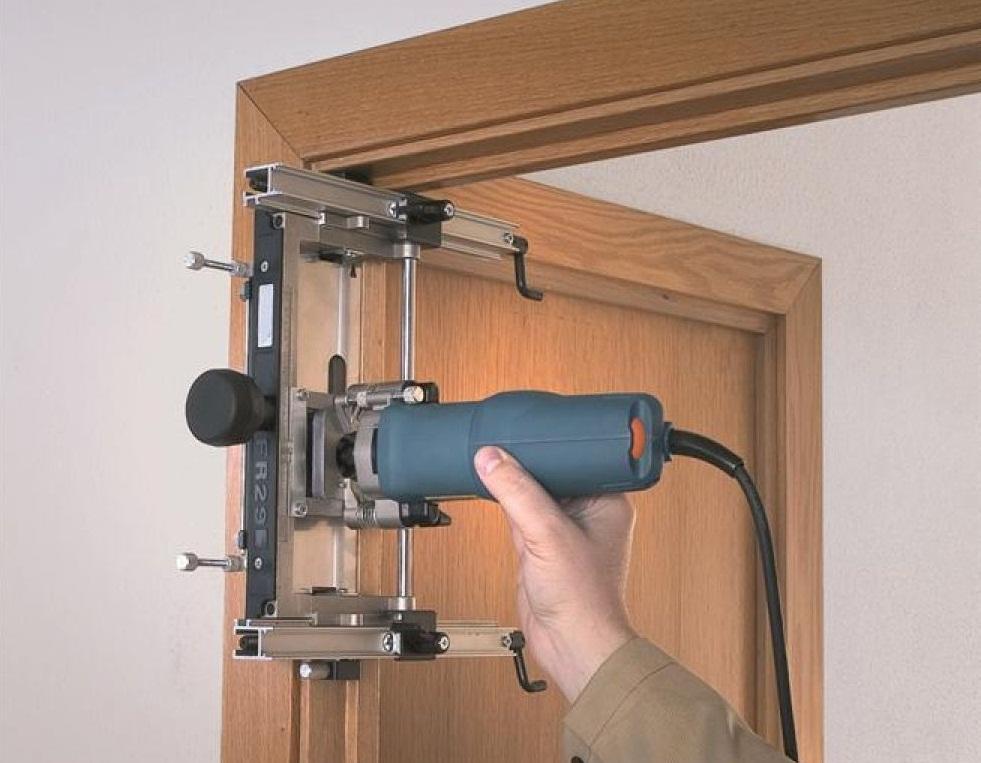 Ручной электрофрезер (плюс специальные фрезы). Устройство используется для врезки петель и замочного механизма. Им также снимают слой древесины с дверного полотна и коробки, делают посадочные места под петли.